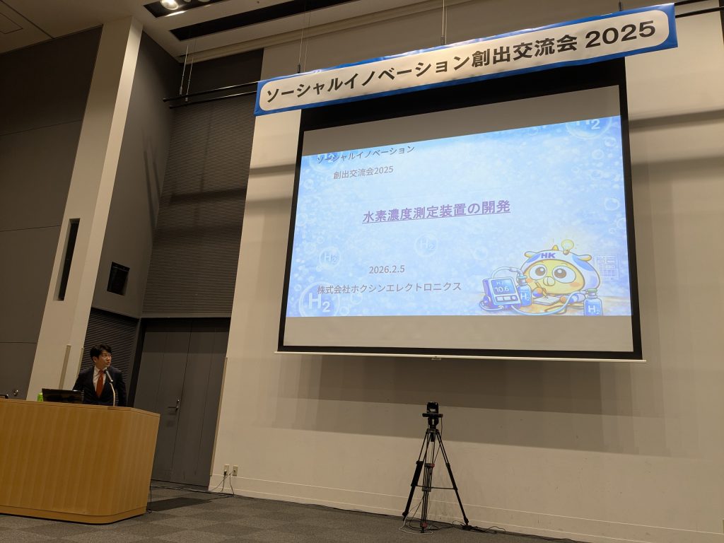 秋田拠点センターアルヴェ多目的ホールにて開催されたソーシャルイノベーション創出交流会において、弊社の開発テーマについて説明を行いました。