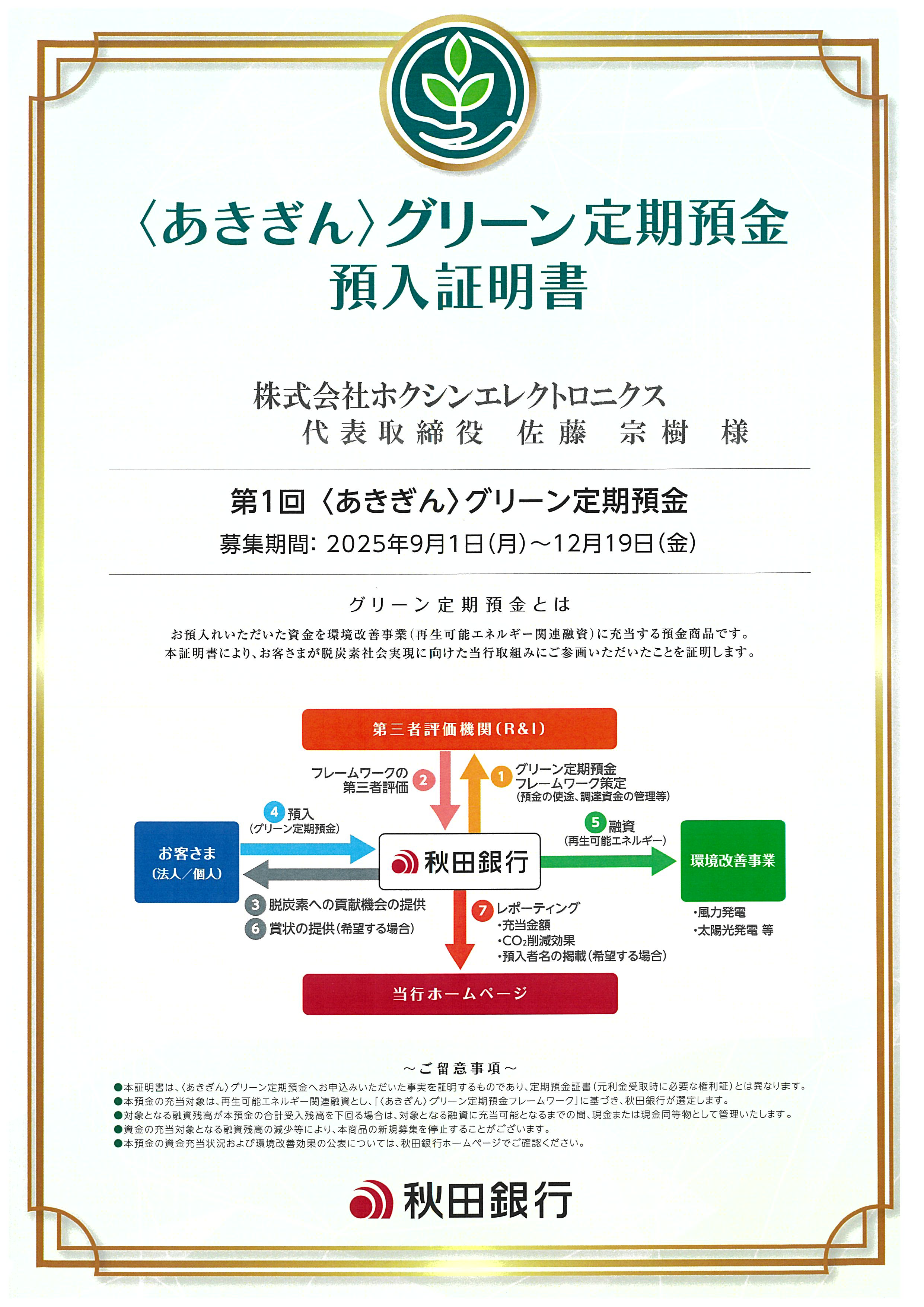 秋田銀行さんより展開されている預金プラン 〈あきぎん〉グリーン定期預金を行いました!