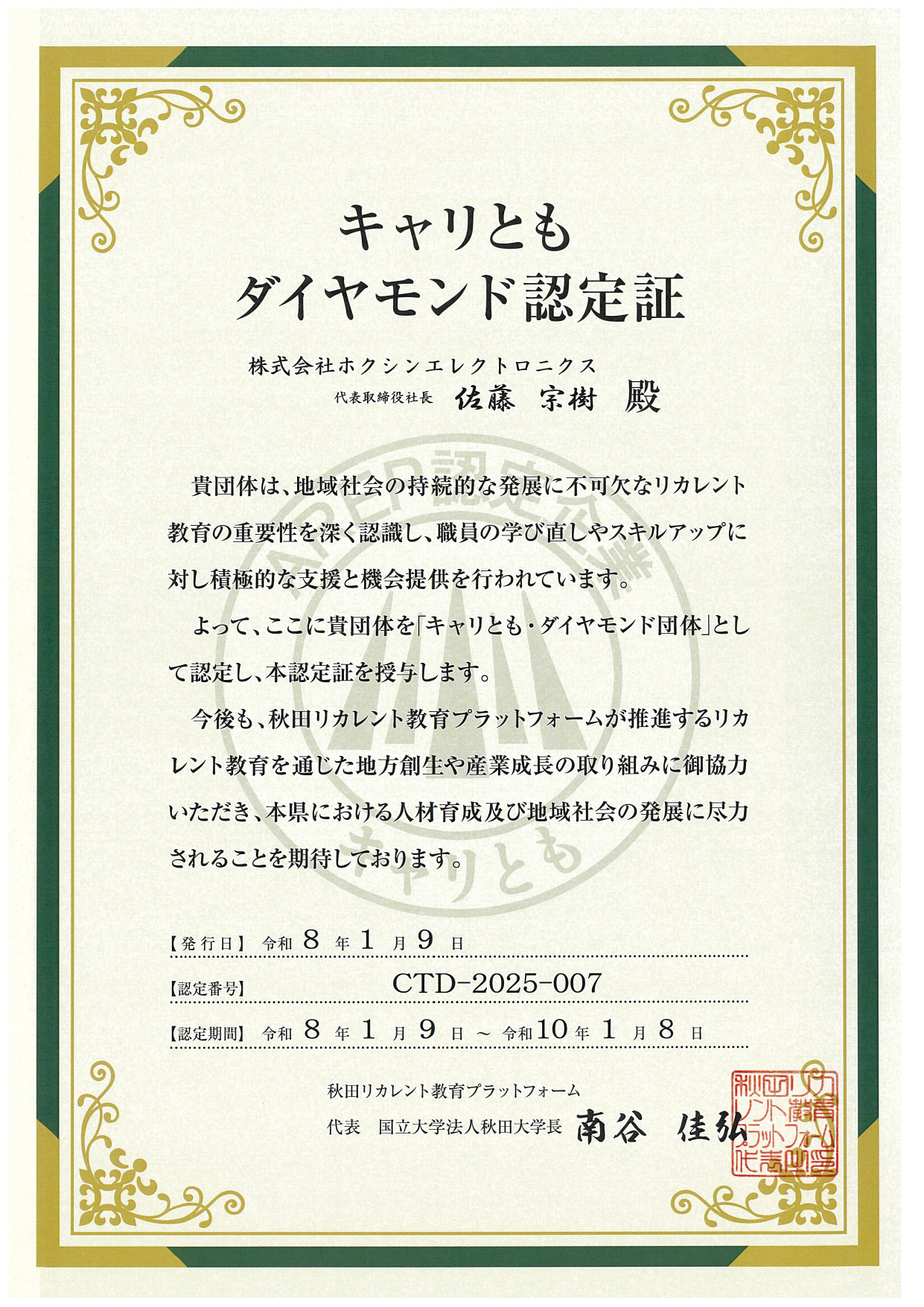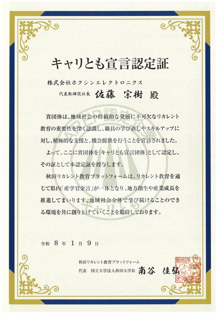 秋田リカレント教育プラットフォーム様より、「キャリとも宣言認定証」ならびに「キャリともダイヤモンド認定証」を賜りました